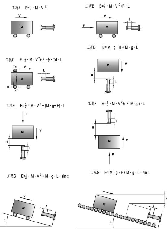在不同工况的冲击方式中列出了缓冲器容量的计算方法,用户可套用公式计算出所需缓冲器的容量,再根据外型尺寸及安装方式等要求,在选型表中选择符合要求的缓冲器型号。